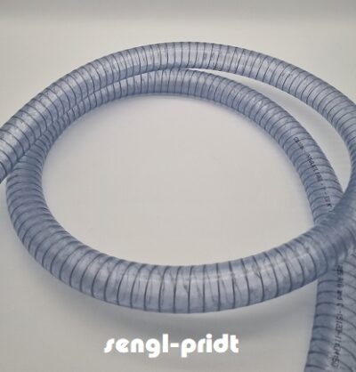 Aufbau: PVC lebensmittelbeständig, klar-transparent, mit eingebetteter Stahldrahtspirale, innen und außen glatt