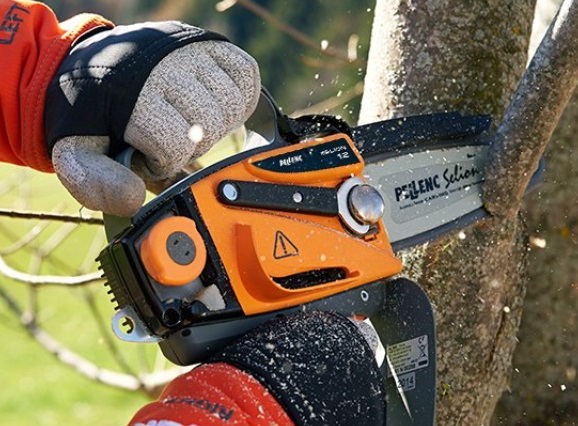 Die Selion Pellenc Handmotorsäge ist besonders leicht, der Pellenc-Kettenschutz aus Faserverbundwerkstoff sorgt für Tosionselastizität und geht bei Quetschungen nicht in die Brüche.