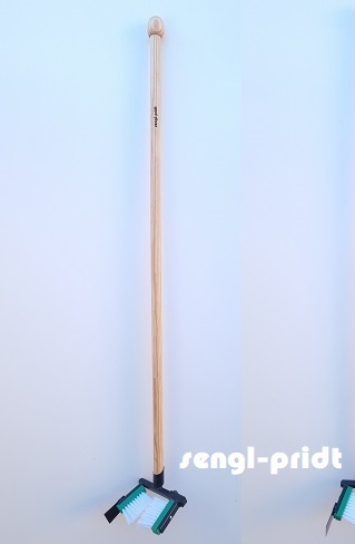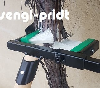 Seine gegenüberliegenden, leicht geneigten Bürsten passen sich an den Stamm an und entfernen die Triebe mittels einer Ziehbewegung.
